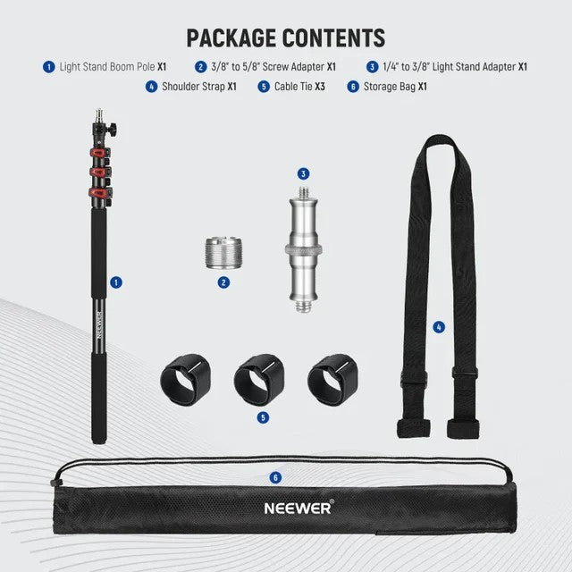 The NEEWER MS-230C Boom Pole Stand is tailored to cater to the precise needs of lighting and audio equipment setup. Whether it's for positioning strobe lights, flashes, or microphones, this stand offers flexibility in angle adjustments and height, ensuring optimal placement to capture the desired lighting angles or achieve the perfect audio recording setup. Its compatibility with various devices makes it an essential tool for professionals across photography, videography, interviews, and audio recording.