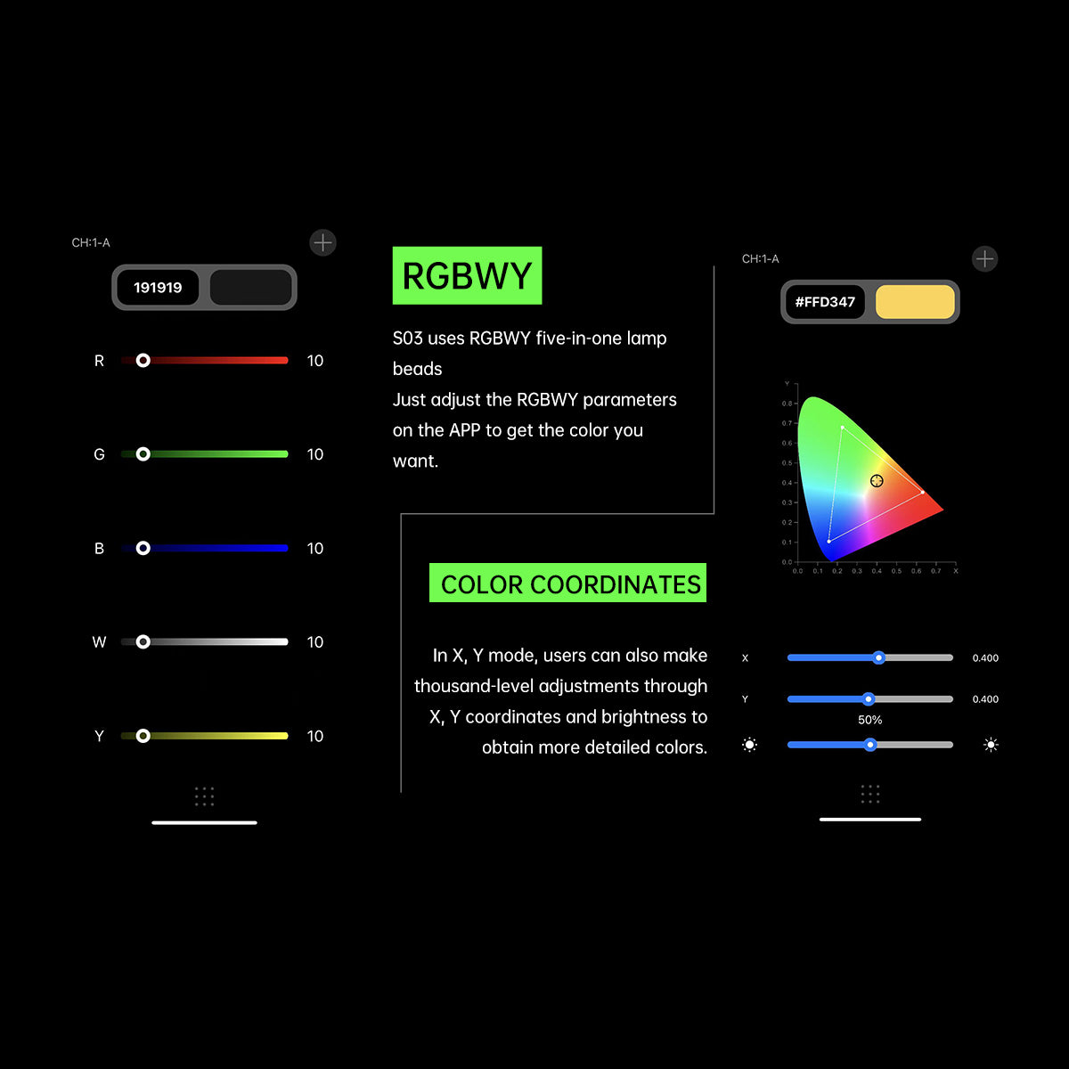 Adjust color hue and saturation freely with S03's RGB colorful-light mode for enriched color-matching inspiration.