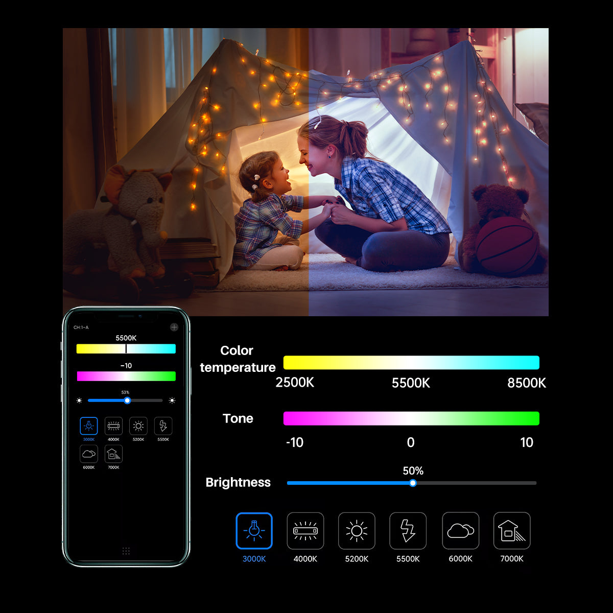 Red / Green tone adjustable: the color temperature and brightness can be adjusted, and the color tone can also be changed. Six fixed color temperatures, easy to choose.